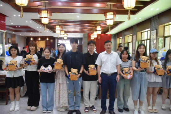 闫清波为获奖学生颁发带有学院纪念徽章的小熊玩偶,获奖毕业生们脸上都洋溢着幸福的笑容。