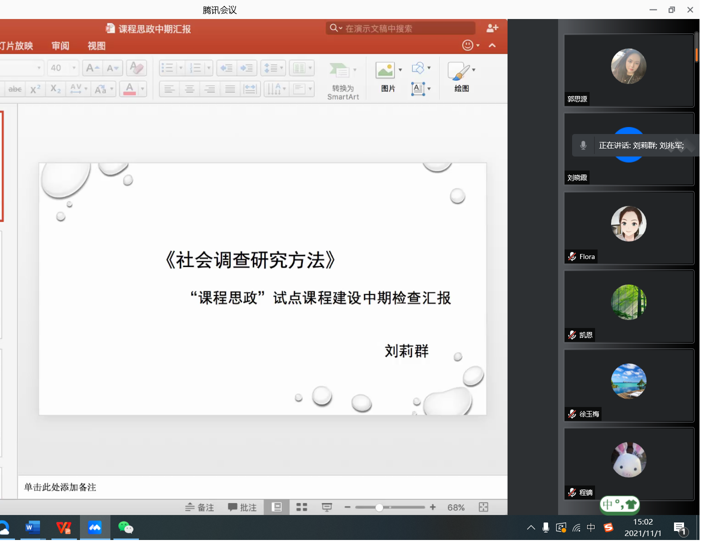 刘莉群老师的《社会调查研究方法》在课程的12个章节中挖掘设计12方面的思政元素,运用项目导向法开展实践调查、分析、总结,增强学生的社会问题意识和社会责任感。