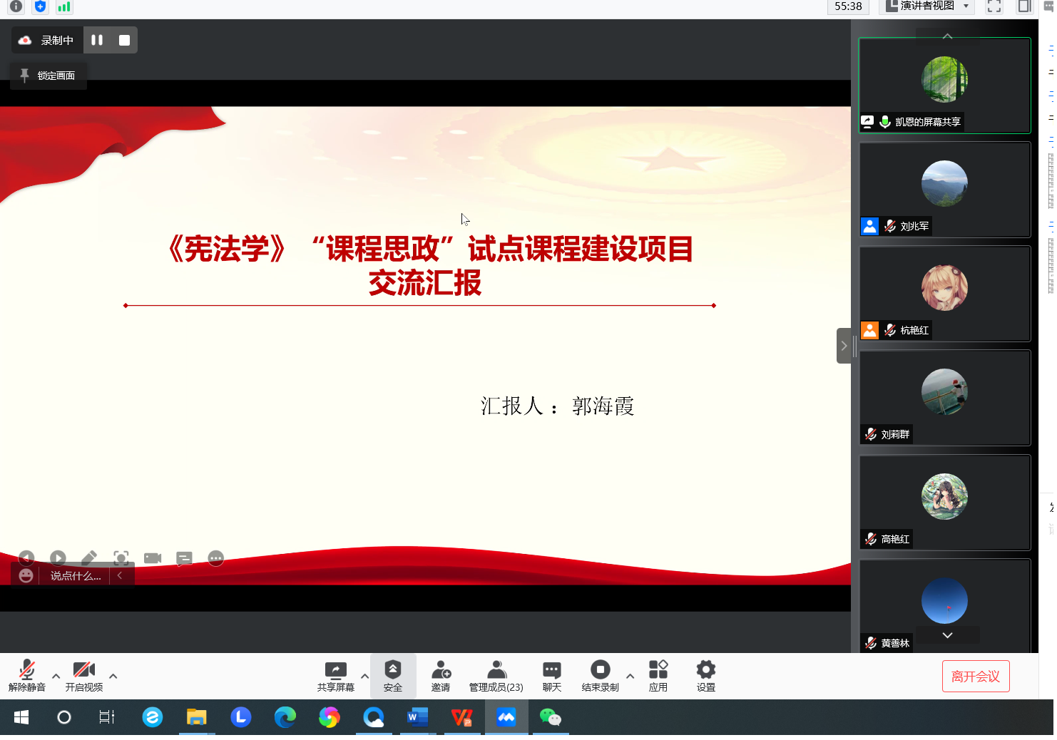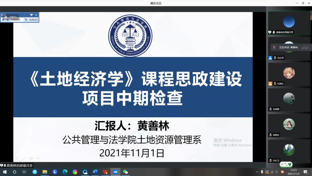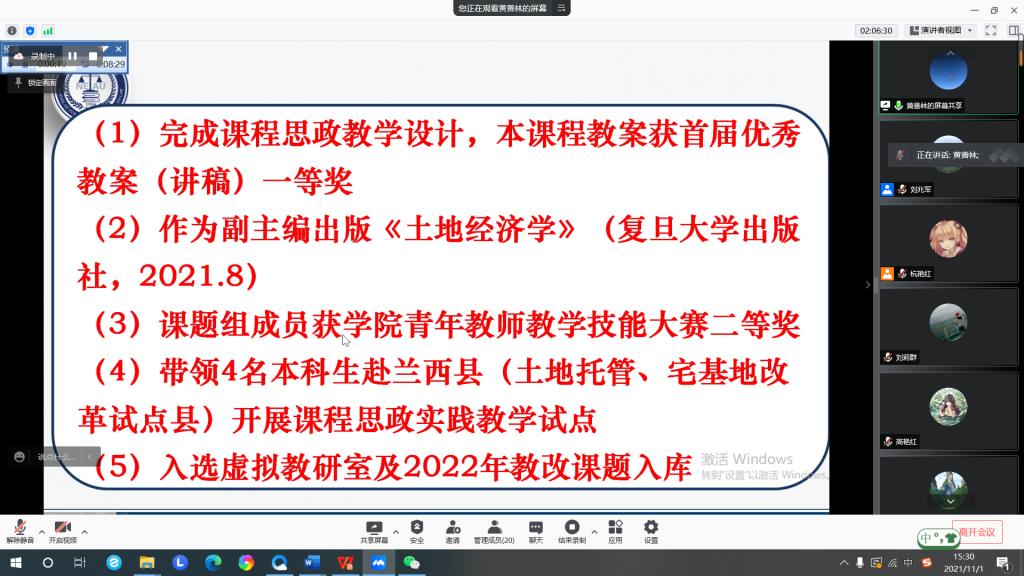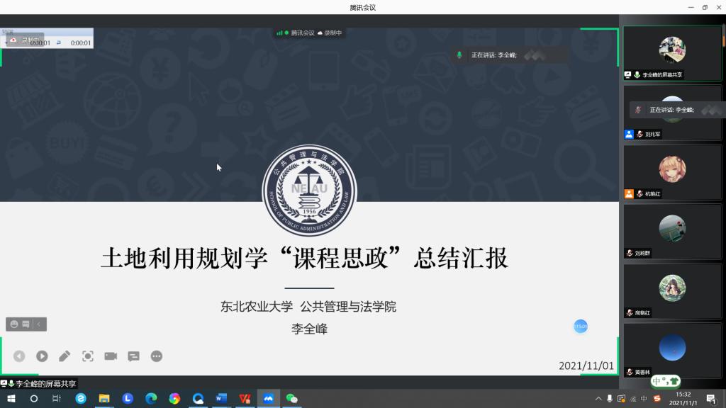 会议中,来自城乡规划、法学、行政管理、土地资源管理、社会工作、土地整治工程6个专业的12位课程思政项目负责人结合具体工作,对承担的课程思政建设理念、内容、案例、方法、成效、问题、改进等方面进行详细介绍,分享交流了12门课程思政的阶段成果,特别是在增强学生家国情怀、专业认同、职业精神,提升理论认知与实践动手能力等方面开展了特色探索,取得了积极效果,引发与会教师的共鸣和积极评价: