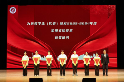 黄善林为获2023-2024学年度星级文明寝室学生(代表)颁奖。