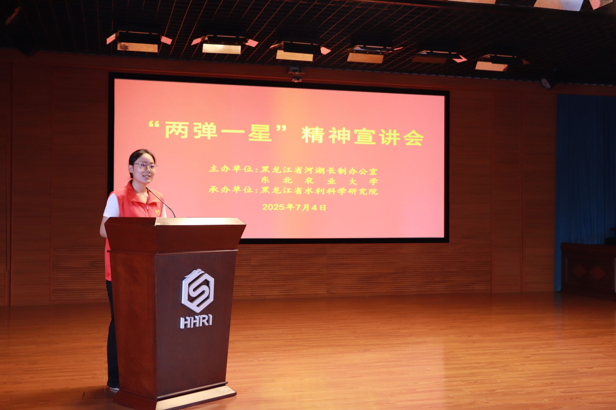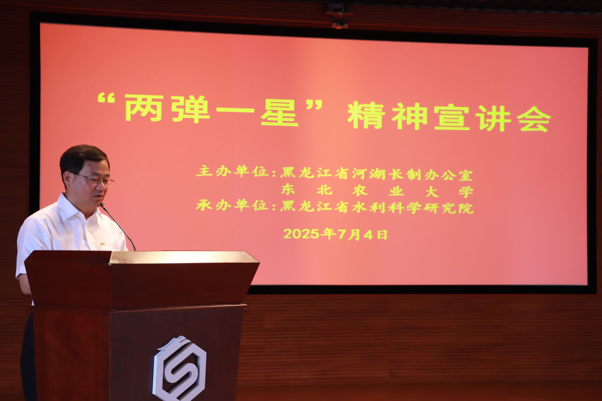 为热烈庆祝中国共产党成立104周年,深入学习贯彻习近平新时代中国特色社会主义思想,全面贯彻落实党的二十大和二十届二中、三中全会精神,大力弘扬和传承“两弹一星”精神,7月4日,tyc5997太阳集团“铸剑为犁”志愿宣讲团赴黑龙江省水利太阳集团开展“两弹一星”精神宣讲活动。黑龙江省水利厅党组成员、副厅长、省河湖长制办公室副主任韩福友,黑龙江省水利厅河湖长制工作处处长张洪斌,我校tyc5997太阳集团党委副书记赵文和、水利与土木工程学院副院长李天霄出席活动。黑龙江省水利太阳集团院党委书记、院长高士军主持活动并致辞。