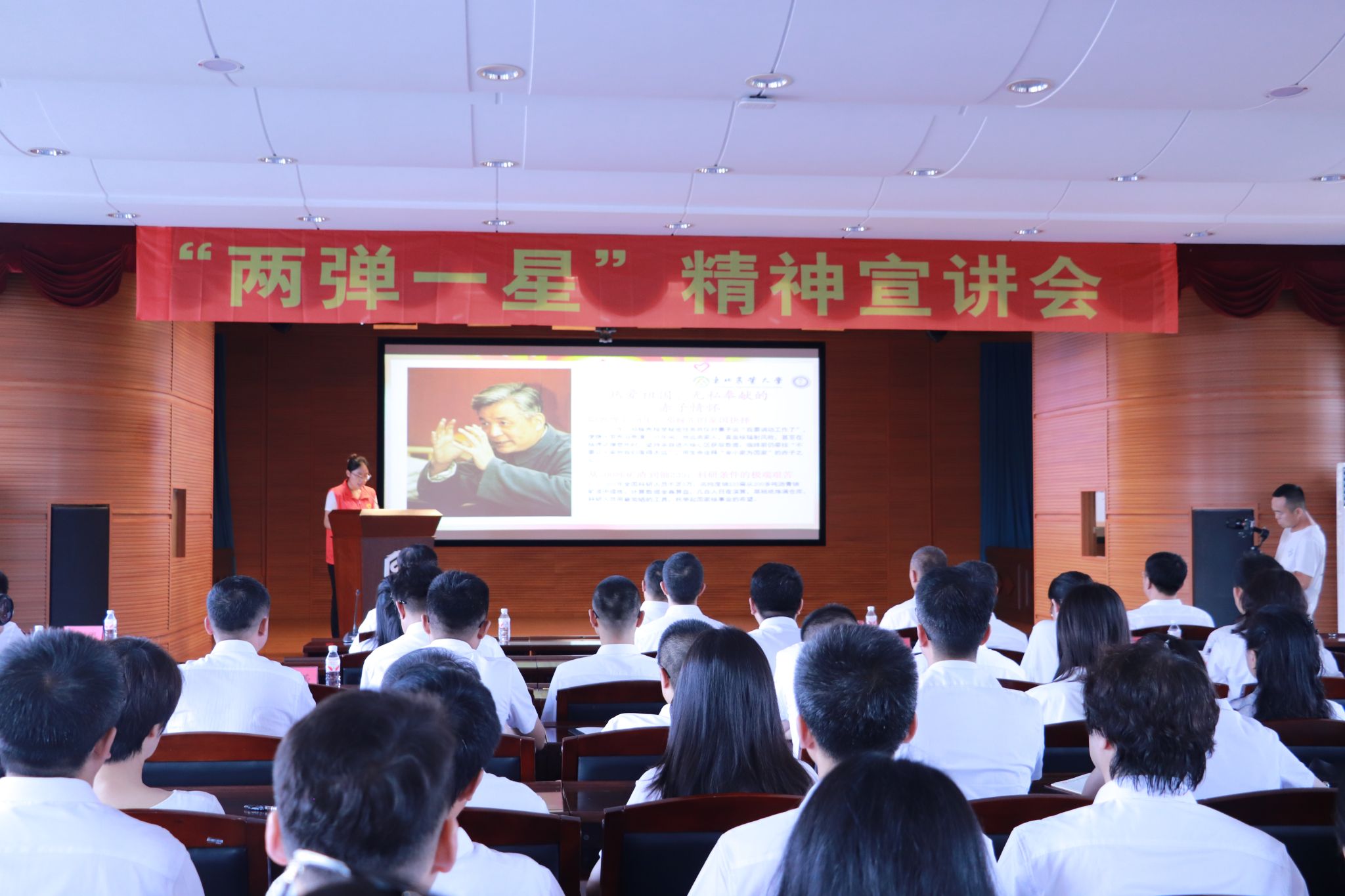 宣讲团成员霍然以《“两弹一星”精神永铸丰碑:从核力量到水利实践的时代传承》为题,围绕“战略抉择”“精神丰碑”“核内容在新时代的体现”“水利实践”“精神永续”五个篇章展开宣讲。通过详实的史料、生动的故事、珍贵的影像,带领党员们重温了那段艰苦卓绝、自力更生的辉煌历程,深情讲述了邓稼先、钱学森、于敏等老一辈科学家以身许国、无私奉献的感人故事,深刻阐释了“两弹一星”精神的丰富内涵,深入探讨了“两弹一星”精神在新时代龙江水利发展的实践演绎。为参会党员上了一堂精彩生动的精神洗礼课。