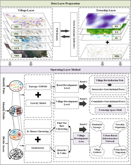 聚焦上述科学问题,研究团队建立“极-场-区-网”框架,揭示乡村地域系统的空间演变模式;进而利用熵权TOPSIS法、引力模型、K-means聚类、地理探测器等方法厘清乡村资源模式及其交互强度;搭建可视化的城乡基础设施网络(URIN)结合其功能特征和发展短板,提出了差异化的优化发展路径,实现从“机理揭示”到“路径落地”的闭环研究。