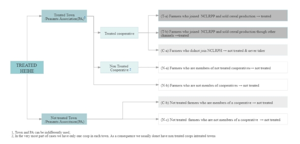 2019年,作者进行了大规模的入户调查,以评估此项目的影响。他们将所有农民按照居住地、是否参加合作社、是否参加NCRPPH分为了七组。最后,基于权重分析,从53个合作社中选择了19个合作社共733名农民完成访谈(每个合作社35-45名农民)。图一清楚地显示了七组农民之间的关系。