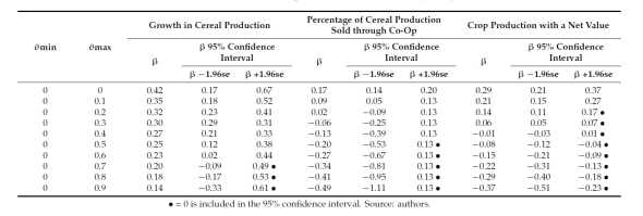 为了评估NCRPPH对农业经营的影响,作者选中了三个结果变量。 首先是2015到2019年间每公顷谷物产量的增长——这个结果用于评估项目的产出方面。第二个结果是每家庭劳动单位(FLU)每公顷作物产量的净值,用来作为家庭收入的代理。第三个变量是通过合作社销售的谷物产值的比例。此外,本文研究了NCRPPH对粮食安全和教育机会的影响。最后,本文考虑了轮作扩大的潜在挤入影响。