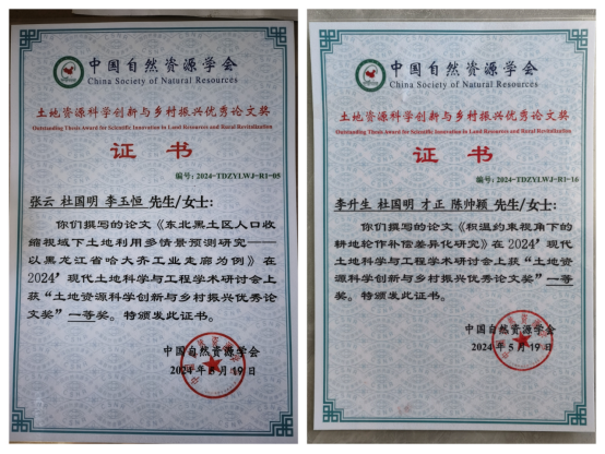2024年5月18日至19日,“2024’现代土地资源科学与工程学术研讨会”在中国地质大学(武汉)顺利召开。会议集聚了来自武汉大学、华中农业大学、南京农业大学等多所高等院校的300余名参会代表。我院农村发展专业2022级硕士研究生张云撰写的《东北黑土区人口收缩视域下土地利用多情景预测研究》和农村发展专业2023级硕士研究生李升生撰写的《积温约束视角下的耕地轮作补偿差异化研究》两篇文章在100多篇征文中脱颖而出,荣获“土地资源科学创新与乡村振兴优秀论文奖”一等奖。