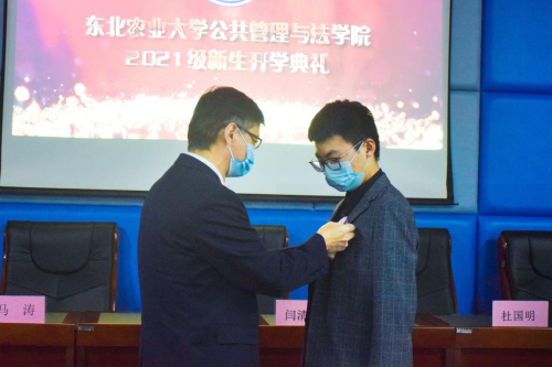 学院党委书记闫清波为新生代表佩戴学院徽章