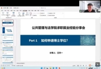农村与区域发展专业博士王天一,硕资环1907班崔钰枫、韩雨、李玥桥,硕管法2002班李晓菲,硕管法2003班董喆六名优秀研究生代表结合自身经历分别从攻读博士的方式和国内外博士的申请程序;国考、省考、选调三类公务员考试的异同;如何找到一份满意的工作以及面试时可能遇到的问题和自己需要做的准备;高校辅导员的报考方式、考试内容以及备考方法;法学专业同学的就业方向以及从事律师行业进入“大所”和“小所”的利与弊; 求职需要做的准备工作包括简历制作和面试的注意事项。在随后的答疑环节,6名优秀研究生代表与参会同学们进行互动交流,耐心解答了同学们提出的问题。