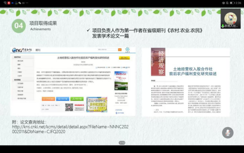 参加本次线上答辩的共计18支团队,项目分为创新训练项目、创业训练项目、创业实践项目三大类,答辩课题涉及科技、法律、文化、农业等领域。各项目团队采用PPT展示的方式对项目的进展以及完成情况进行汇报。评委深入分析各个项目的不足之处并提出合理建议,各团队积极回答评委提出的问题,并与评委们交流意见,整个答辩会议紧张有序。各个团队在本次答辩中不仅展示了项目所取得的成果,更展示出了学生们对于创业创新的高度热情。