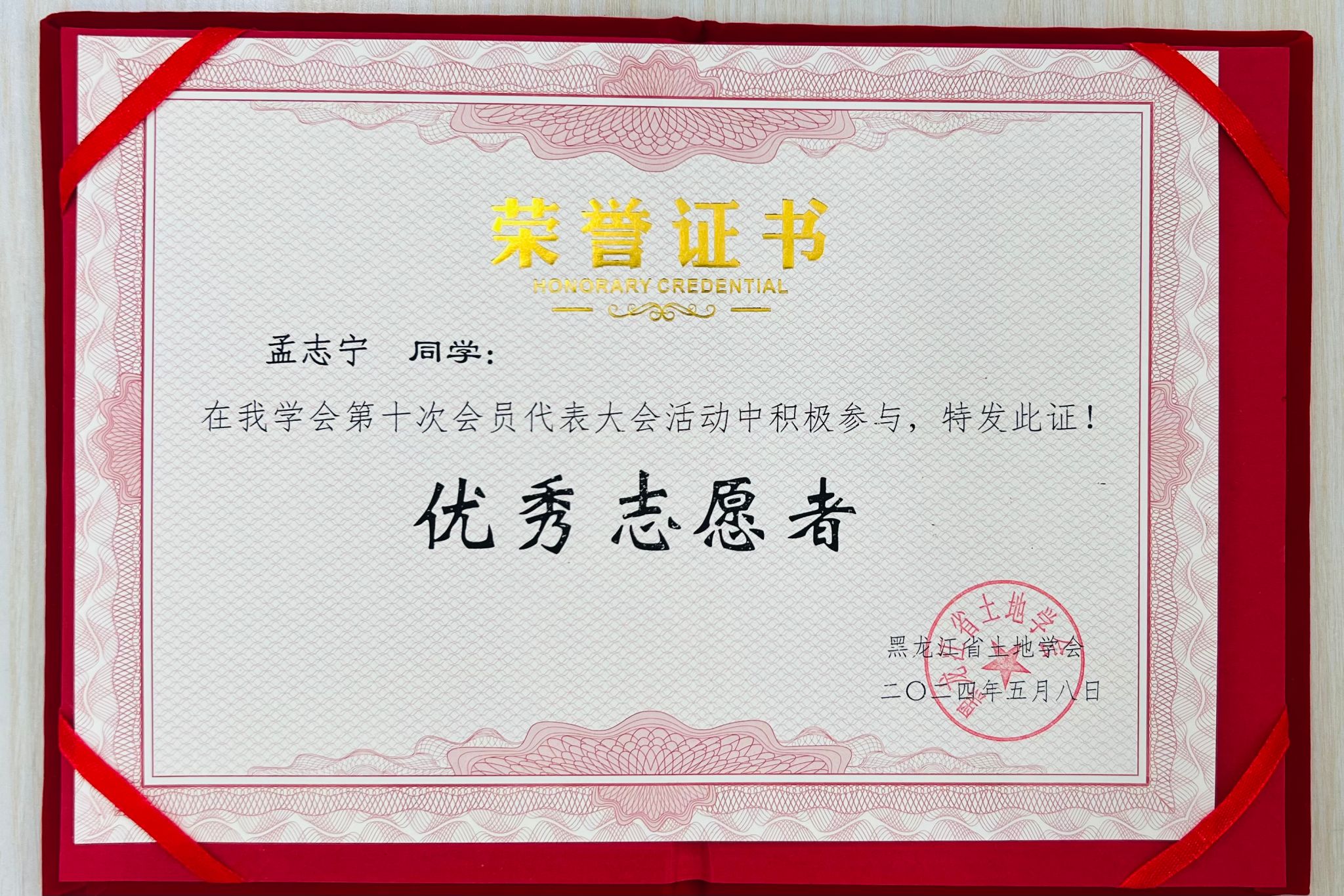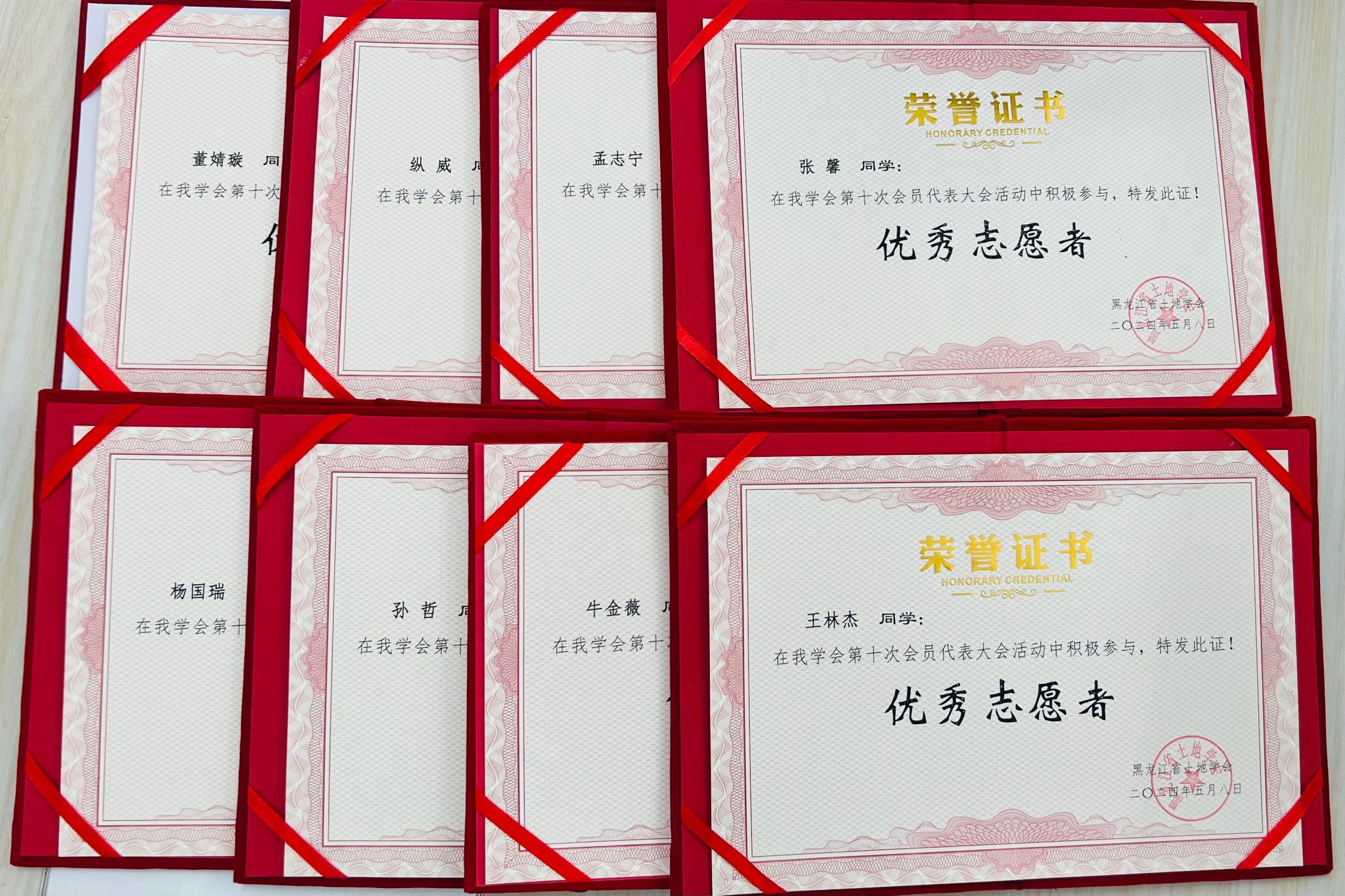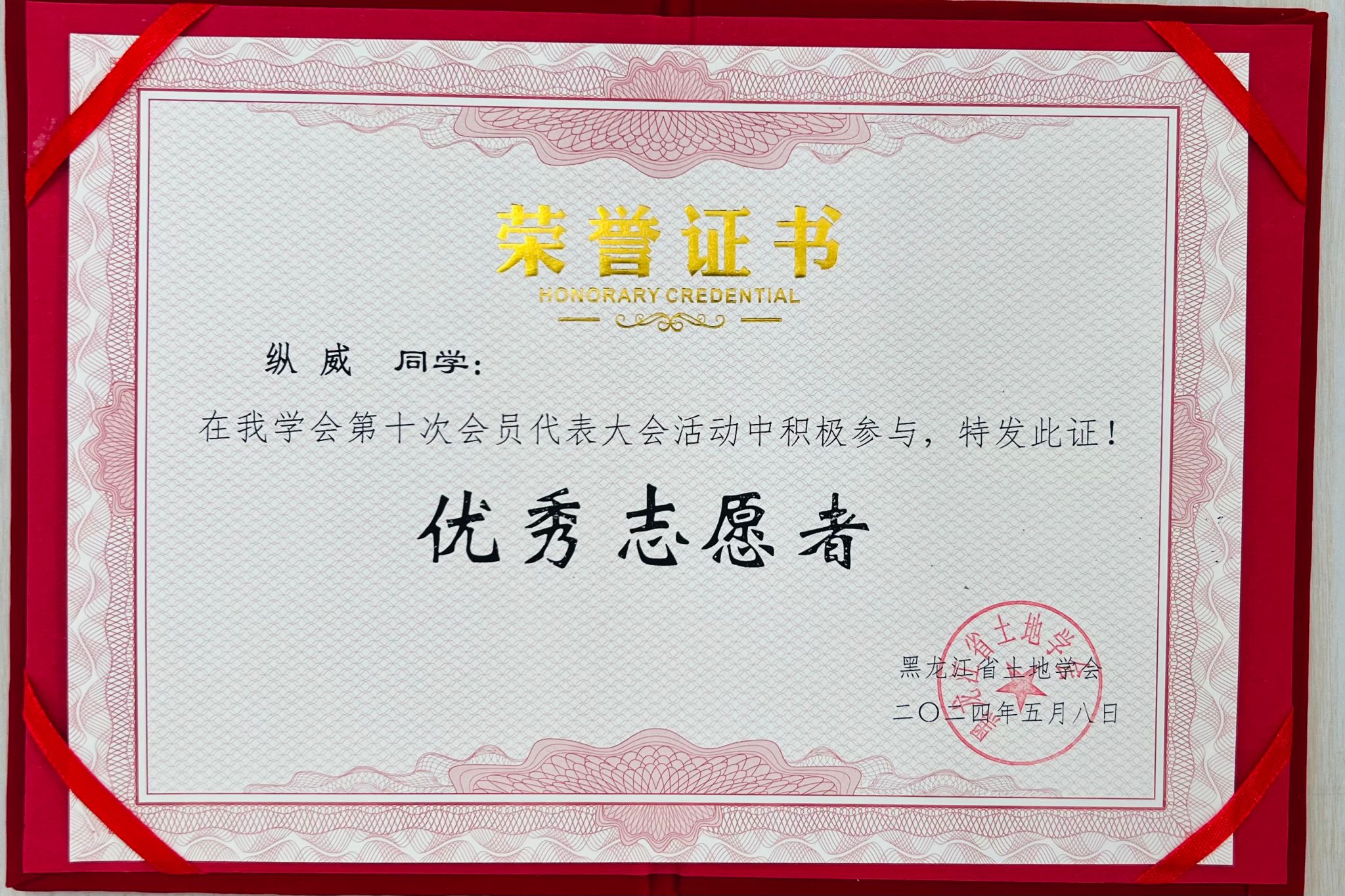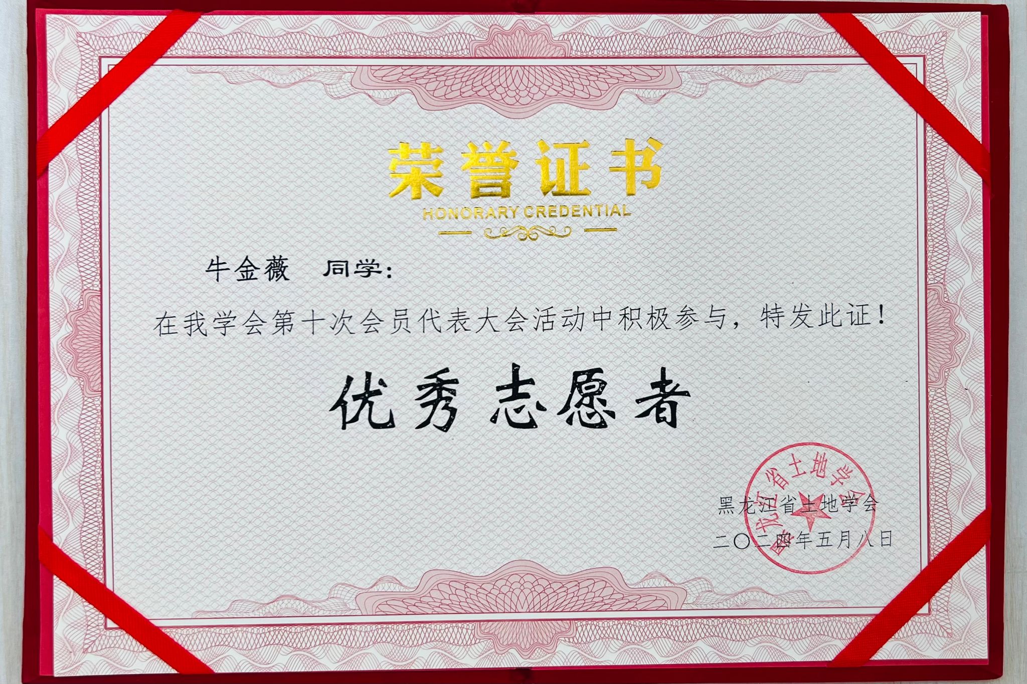 (图为黑龙江省土地学会为志愿者们颁发志愿证书和纪念品)