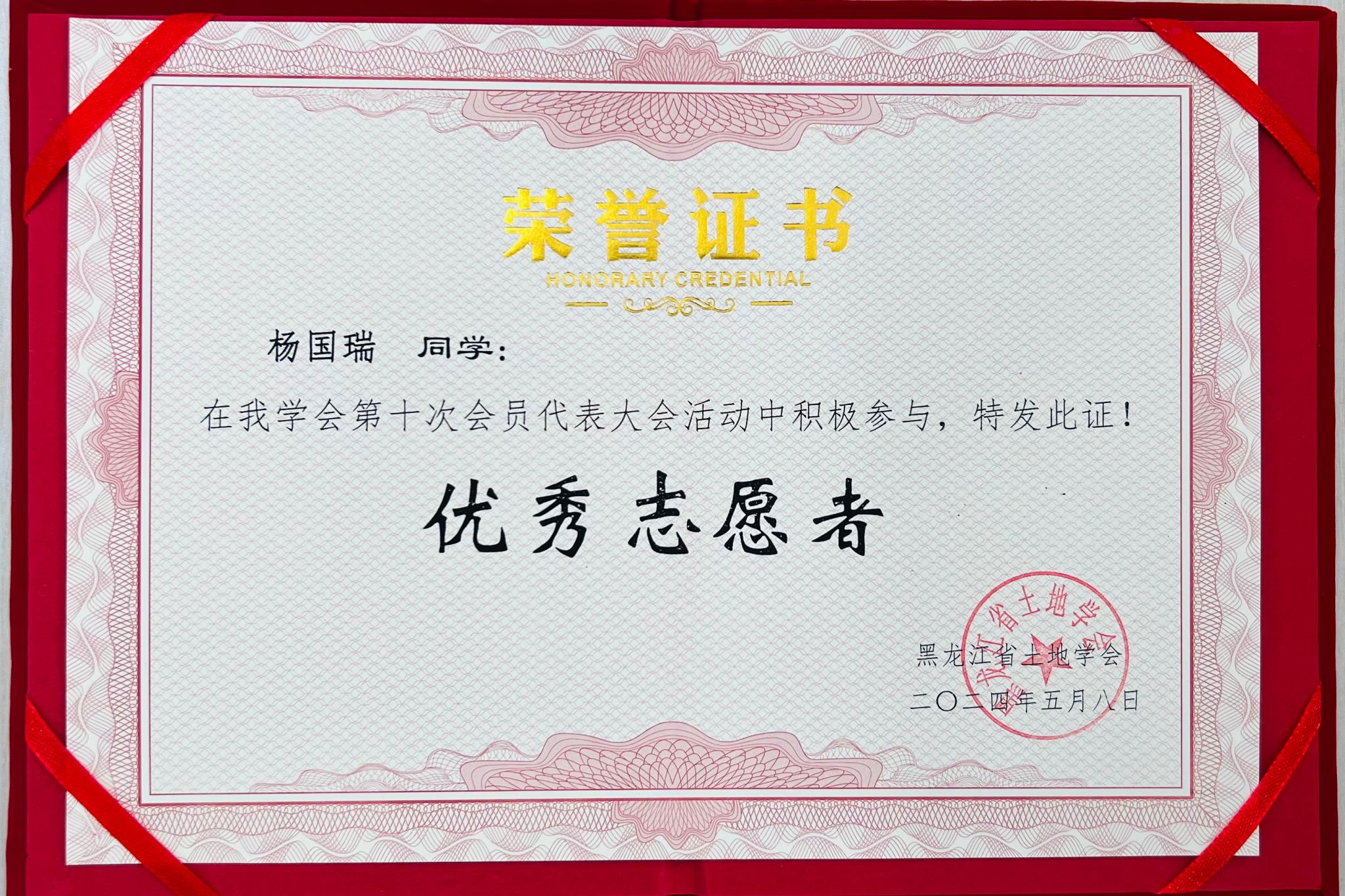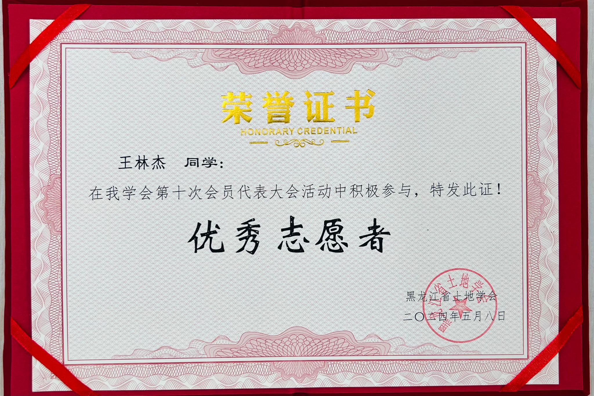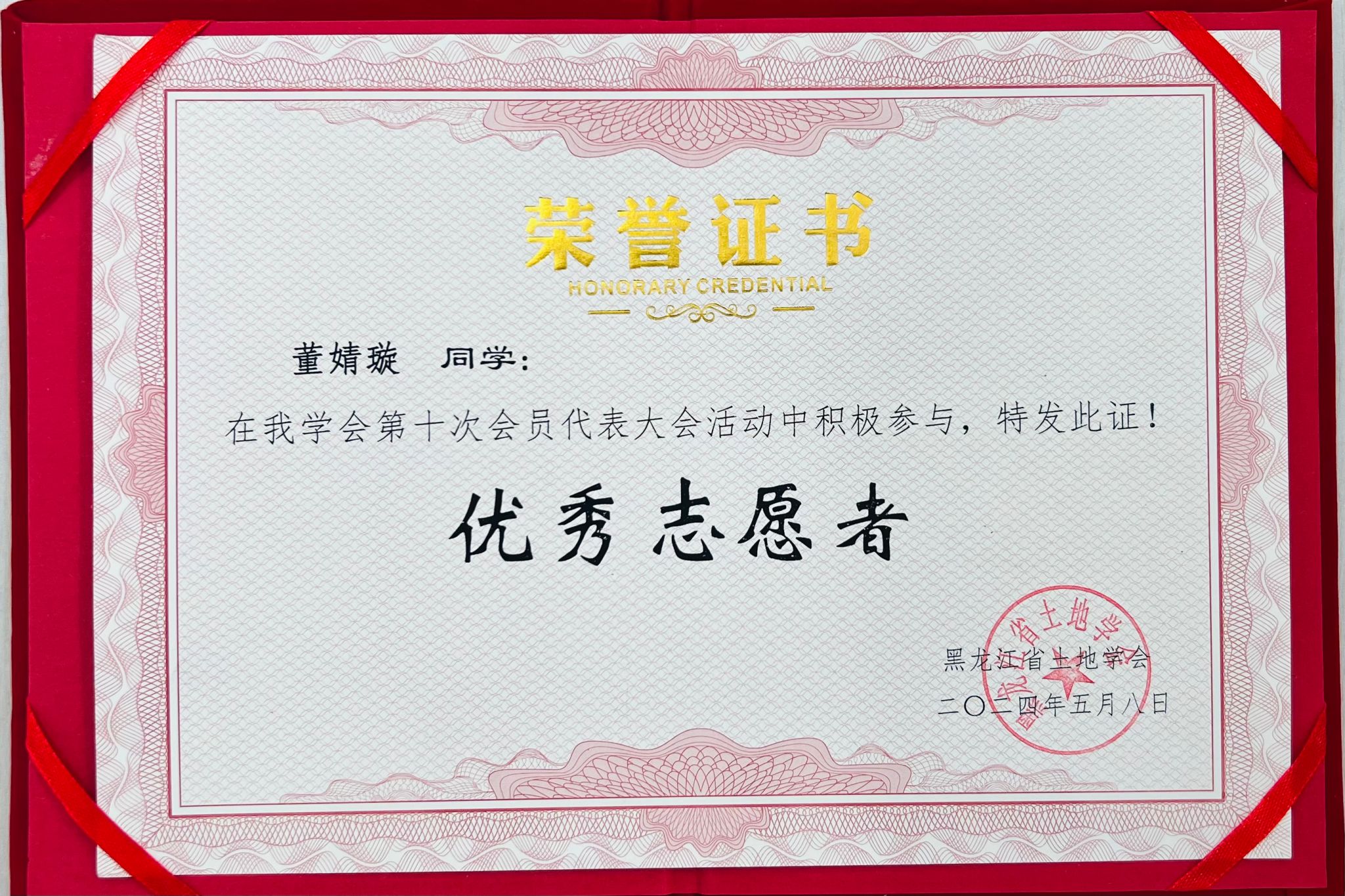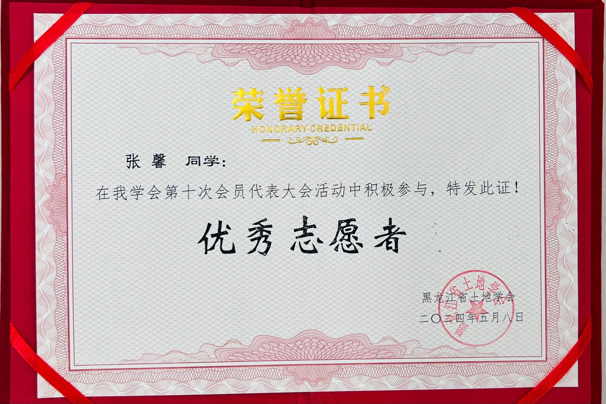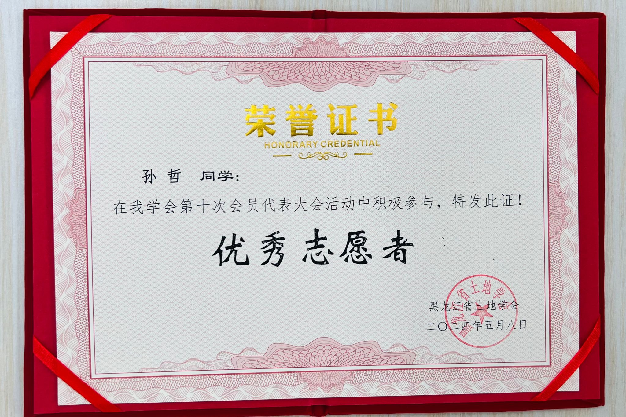 (图为黑龙江省土地学会为志愿者们颁发志愿证书和纪念品)