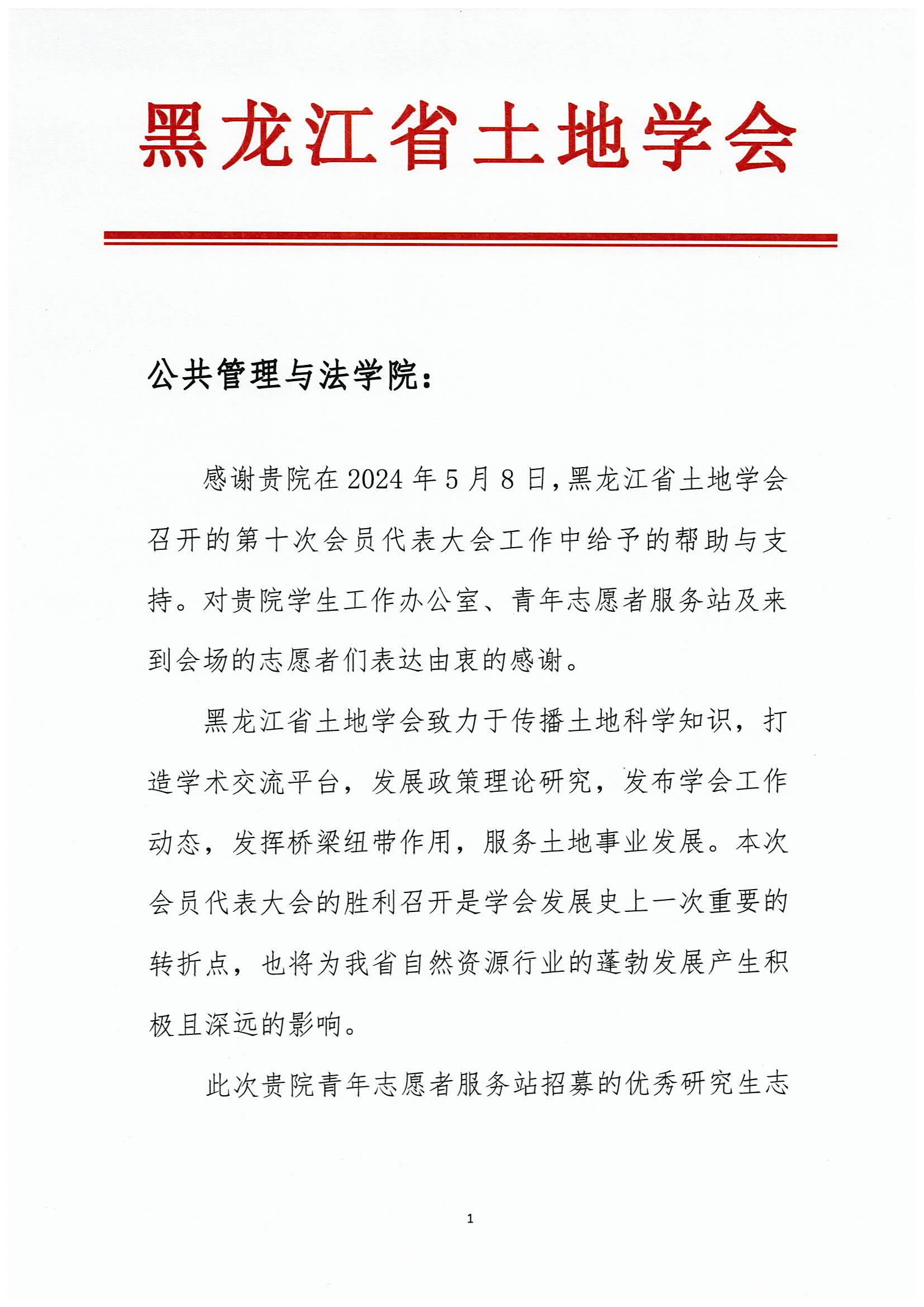 我院学生工作办公室、青年志愿者服务站非常荣幸能收到省土地学会的感谢信,感谢省土地学会对我院学生工作和志愿者们的认可与赞扬。我们同样期待与学会的下一次合作,祝愿双方在未来的日子里发展蒸蒸日上,不断取得新的成就,在学术的海洋中扬帆起航,开创更加美好的未来。