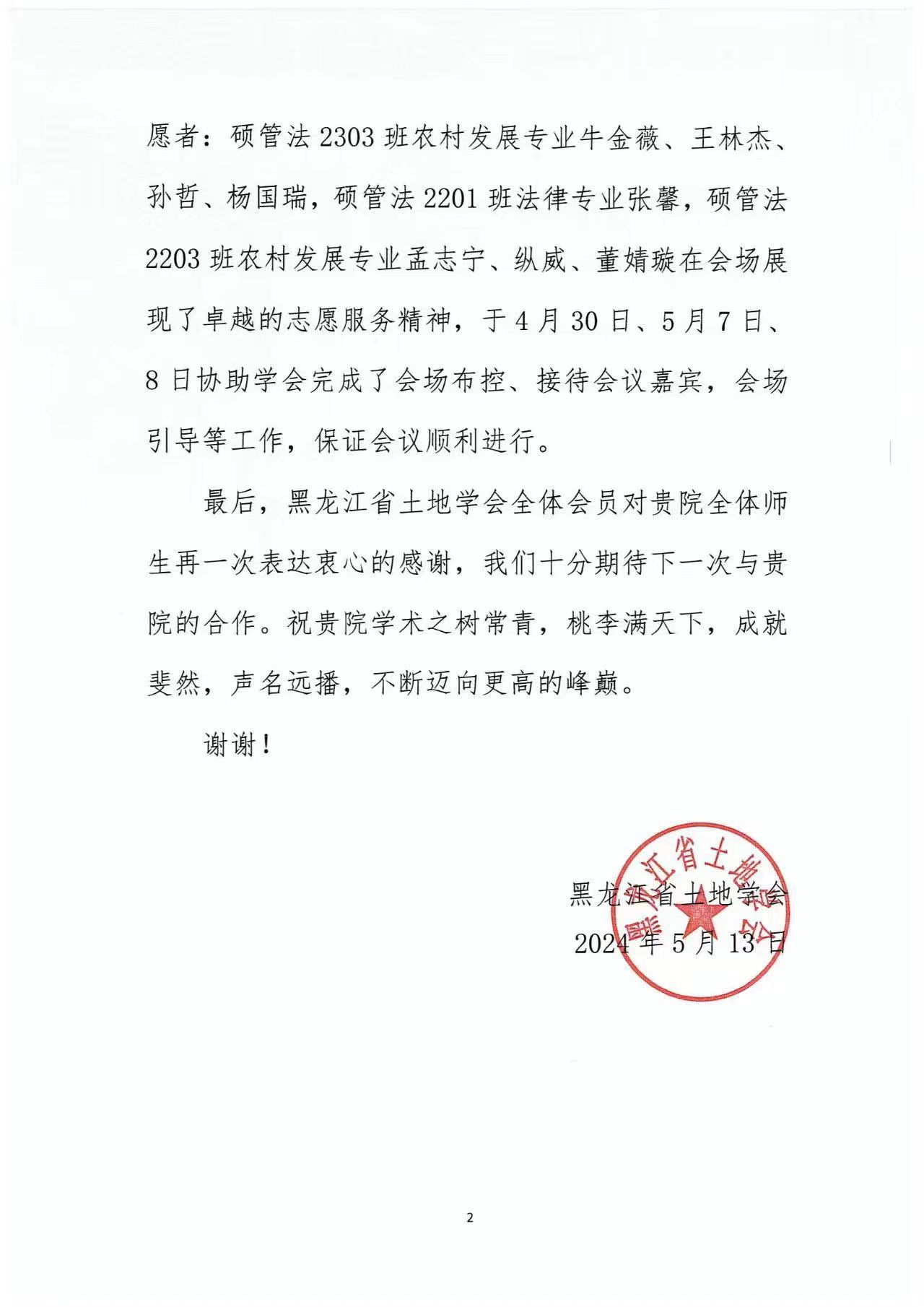 黑龙江省土地学会对我院学子在会议中展现的卓越志愿服务精神,提出了高度赞扬;对我院学生工作办公室、青年志愿者服务站在本次会议工作中的鼎力支持表达了由衷的感谢。