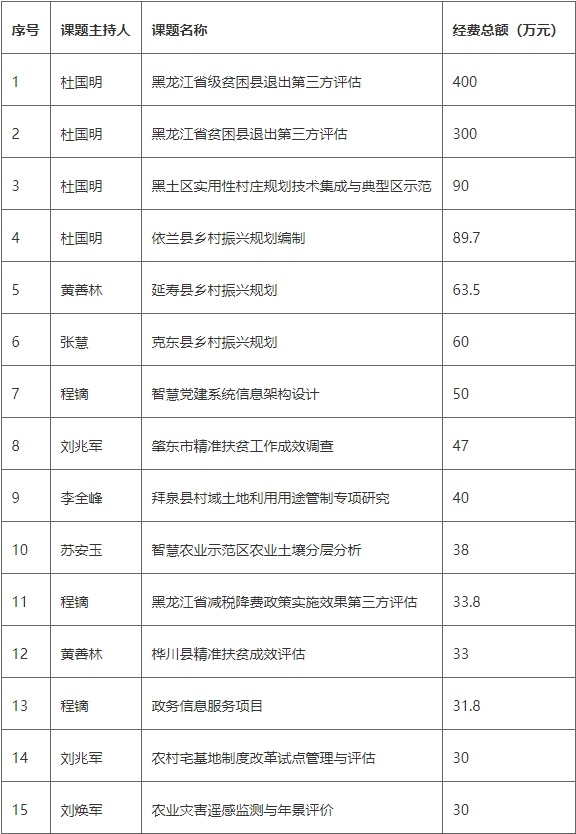 学院围绕黑土地保护、农村土地制度改革、精准扶贫与精准脱贫、宅基地改革、政务服务、营商环境建设、涉农法治、土地整治、乡村规划等方面与各级政府合作,服务实践需求、凝练科学问题、推动学科发展。“十三五”以来,获得横向合作项目125项,科研经费4132.64万元;向黑龙江省委省政府、国务院扶贫办、省人大和政协、哈尔滨市委市政府提交决策建议,获得省领导批示10余次、部门采纳70余次;脱贫攻坚评估区域涵盖黑龙江、吉林、内蒙古、河北等省的60余县,走访3万余农户、30余个乡镇政府部门;政府改革成效评估涵盖全省13个地市241个部门;围绕精准扶贫、乡村振兴、政府服务等开展培训达50余场、4万余人次,其中培训处级干部达1000余人次;为望奎县、拜泉县、延寿县等202个村编制了村庄规划,编制省级国土空间专项规划20余项;开展宪法、土地法等法制宣传20次;对50余个社会组织进行评估。